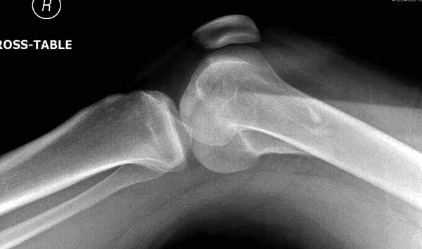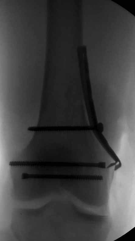 Однако в случае, представленном Константином Никитиным, не может быть применён ни ретроградный ни антеградный остеосинтез. Причина - нереально выполнить вышеуказанные необходимые требования, касающиеся дистальных блокирующих винтов. Из-за низкого перелома латерального мыщелка (перелом Hoffa) невозможно через него провести хотя бы 2 блокирующих винта, поскольку линия перелома мыщелка расположена либо на уровне верхушки межмыщелковой ямки либо незначительно проксимальнее. Поэтому авторам, с моей точки зрения, необходимо прислушаться к рекомендациям Джолдаса.
