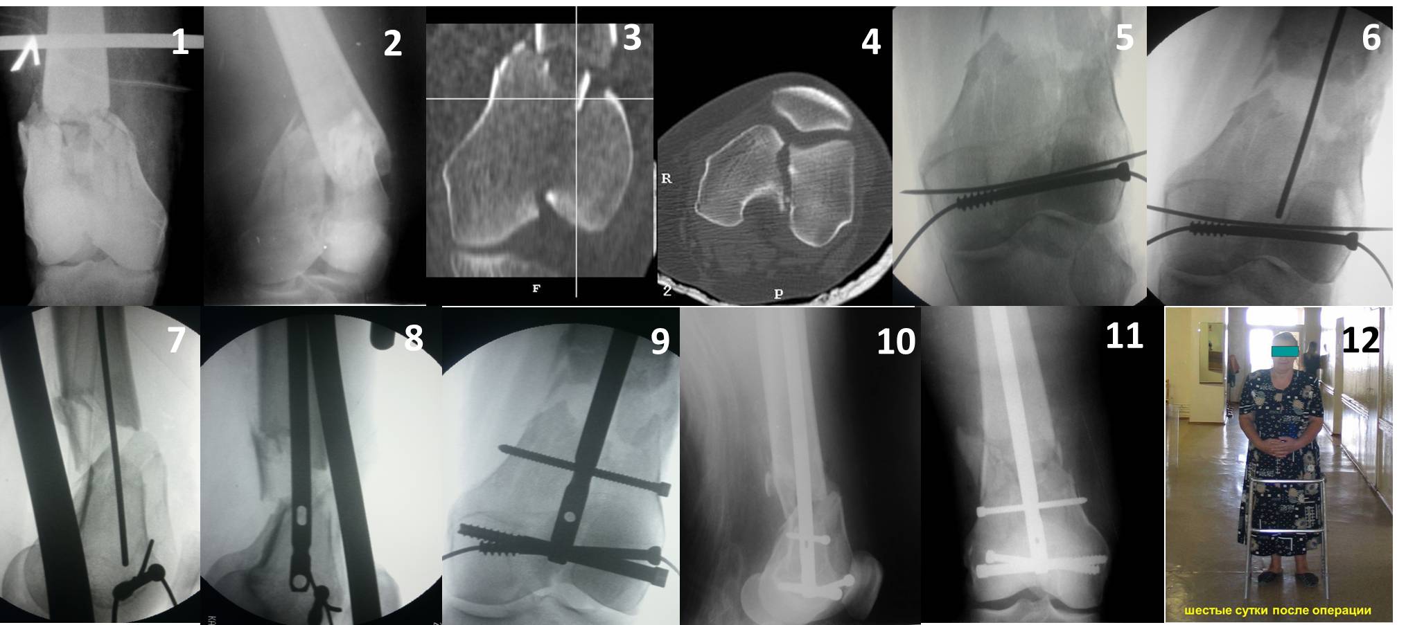 В приложении пример недавней операции, C3, открытая репозиция, фиксация мыщелков спицами и винтами, ретроградный синтез большеберцовым гвоздем 10,5 мм диаметром, винты 5 мм.