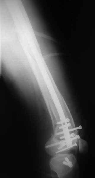 Однако в случае, представленном Константином Никитиным, не может быть применён ни ретроградный ни антеградный остеосинтез. Причина - нереально выполнить вышеуказанные необходимые требования, касающиеся дистальных блокирующих винтов. Из-за низкого перелома латерального мыщелка (перелом Hoffa) невозможно через него провести хотя бы 2 блокирующих винта, поскольку линия перелома мыщелка расположена либо на уровне верхушки межмыщелковой ямки либо незначительно проксимальнее. Поэтому авторам, с моей точки зрения, необходимо прислушаться к рекомендациям Джолдаса.