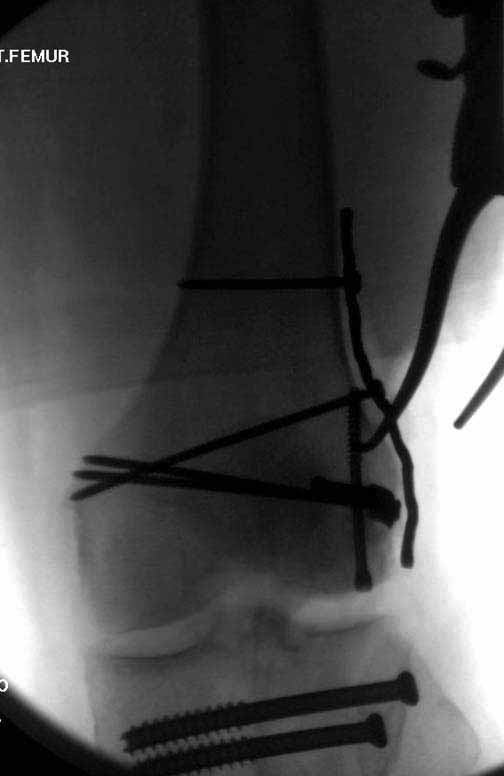 Так что можно и закрыто джойстиками под контролем сопоставить мыщелки, прошить спицами, а потом синтезировать пластиной для дистального бедра, стержнем анте- или ретроградно, или аппаратом. Не получается джойстиками - небольшую артротомию сделать.