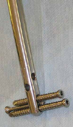 >Такую конфигурацию расположения блокирующих отверстий на дистальном конце имеет стержень для большеберцовой кости фирмы ChM. Для бедренной кости такой стержень мне неизвестен. Поэтому в необходимых случаях (хорошо, что такие случаи встречаются не часто), как вариант, мы