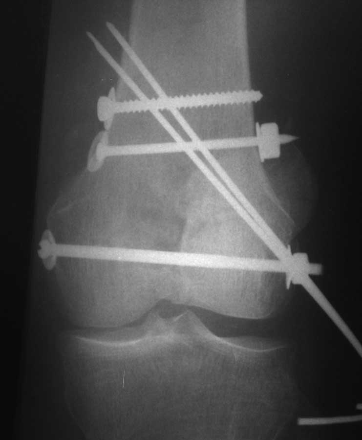 Выбор имплантов не совсем удачный, подкожно выступающие болты в мыщелках вскоре могут привести к проблемам. Вместо солитарной фиксации болтом-стяжкой дистально можно было бы добавить пару винтов, которые создали бы ротационную стабильность и межфрагментарную компрессию.