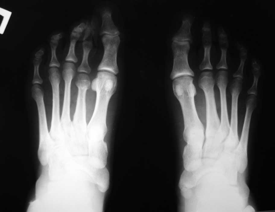 Лучше, когда на все равномерно. Но у данной больной удлинены 3 и 4 плюсневые. И значит на них, возможно, приходится избыточная нагрузка. К тому же еще раз обращаю Ваше внимание на толщину диафиза 2 плюсневой, которая свидетельствует о ее функциональной перегрузке. Возможно, ее головка расположена ниже остальных. Оценить расположение головок по переднезадним рентгенограммам мы не можем.