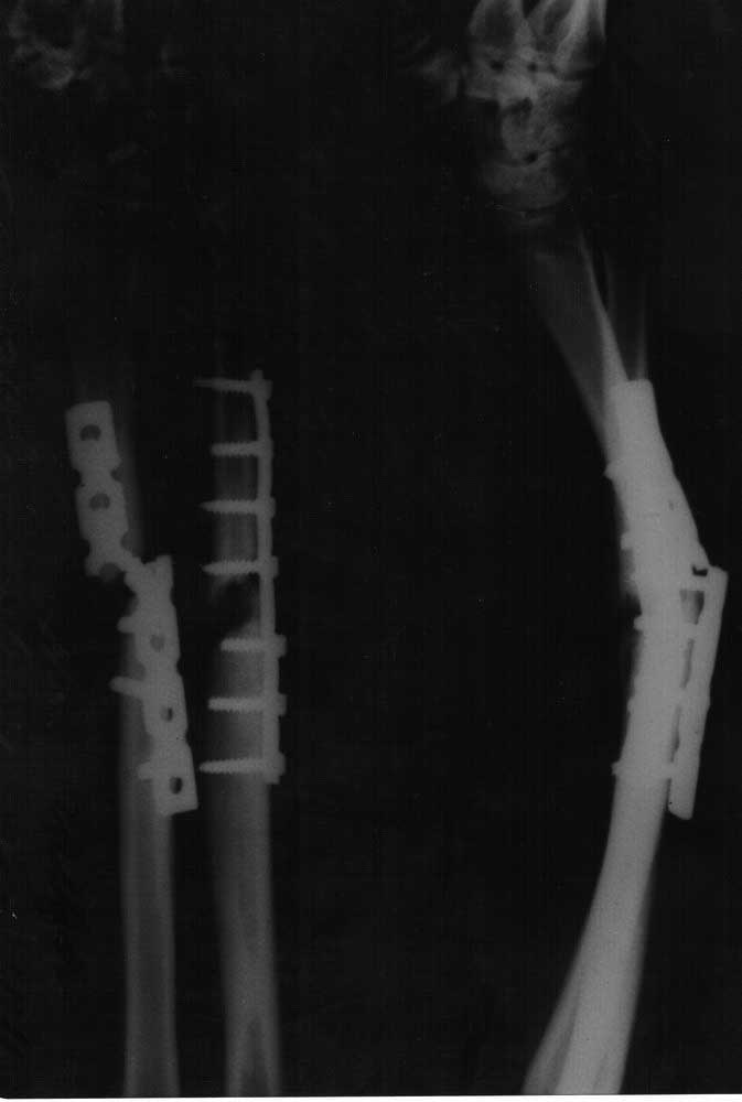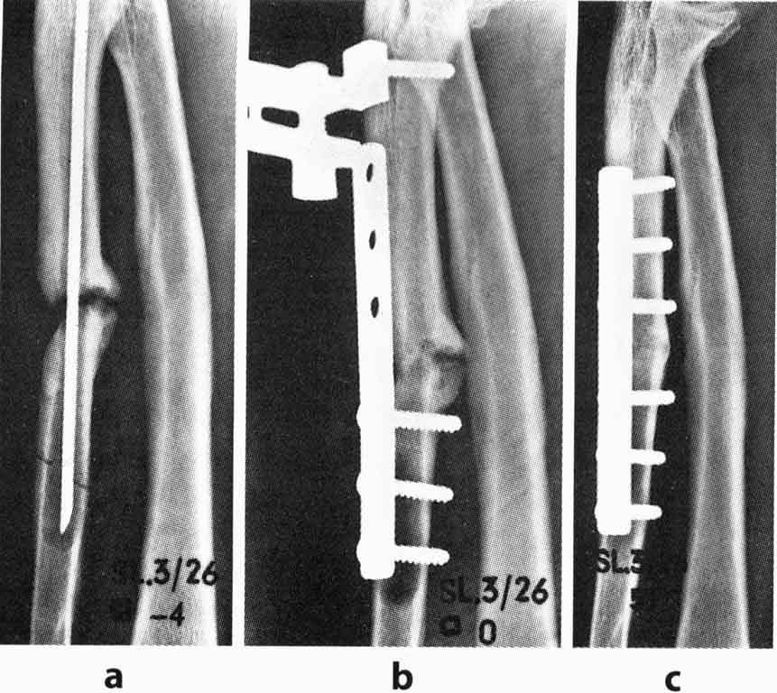 PS Напоследок – пример. Л.Г., 61 год, псевдоартроз локтевой кости после интрамедуллярной фиксации. Первичные документы утеряны (Рис. а), дефект и остеолизис. Стабилизация шести дырчатой пластиной, компрессия стягивающим устройством (Рис. в). Консолидация через год (Рис. с). Пример из Urs F.A. Heim. The AO Phenomenon. Foundation and early years of the Association for the Study of Internal Fixation.