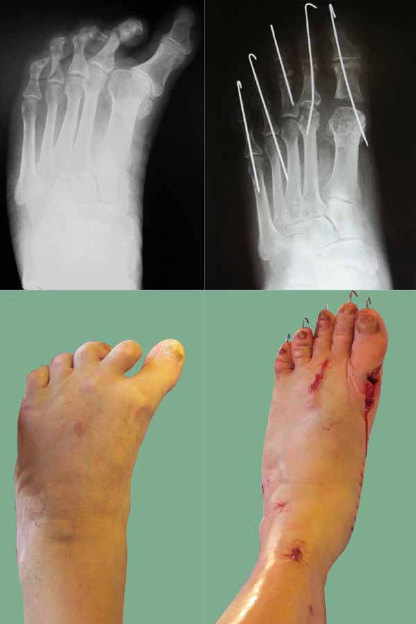 Чтобы точнее ответить на Ваш вопрос, нужно знать, каковы основные жалобы пациента. Беспокоит ли его что-то, кроме варусного отклонения большого пальца? Является ли фиксированной деформация латеральных пальцев? Есть ли натоптыши на подошвах? Есть ли симптомы периферической нейропатии (был ли поврежден при заборе вен какой-нибудь нервный ствол)? Вполне возможно процесс идиопатический, а не ятрогенный. В любом случае, в таком возрасте и через 5 лет после начала заболевания расчитывать на успех сухожильнокапсульных пластик сложно. Наиболее вероятный вариант - артродез 1 плюснефалангового сустава. Если латеральные пальцы выпрямятся при установке на место большого, артродезом можно ограничиться, если нет - будет зависеть от того, какие пальцы не стали на место и сколько им не хватает. Вариантами могут быть медиальные капсулотомии плюснефаланговых суставов или укорачивающие остеотомии основных фаланг или плюсневых костей. И нужно помнить, что артродез достаточно травматичная операция для пациента с возможными сосудистыми нарушениями. Минимум железа. Лучше всего 2 внутрикостных винта (без головок). И деликатное отношение к мягким тканям.