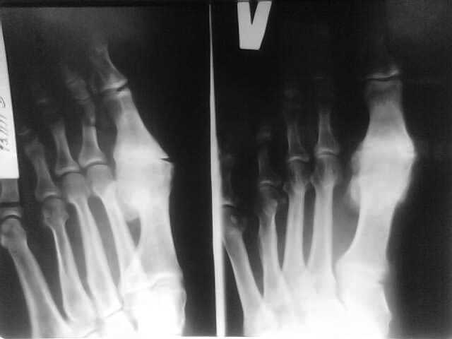 За помощью никогда не обращался. В настоящий момент беспокоят боли в области 1 плюсне-фалангового сустава, нарушающие походку, периодические щелчки в этой области. Объективно: область 1 ПФС увеличена в объеме за счет костных разрастаний, признаков воспаления нет, омозолелая кожа на внутренней поверхности, движения в суставе качательные, б/болезненные. Хочет избавится от боли и щелчков, как можно быстрей. Извините за качество снимка- сфотографировано телефоном.
