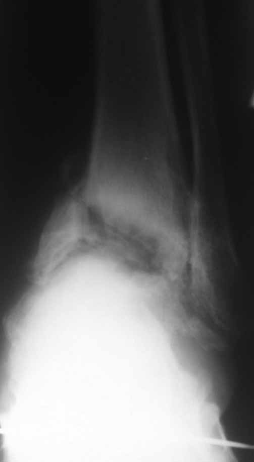 Из того, что я вместе с лучевыми диагностами разглядел - нельзя исключить остеомиелит (?) - есть краевая реакция, куча элементов, похожих на секвестры. Смущает полное отсутствие местной и системной реакции - к анализам не придраться.