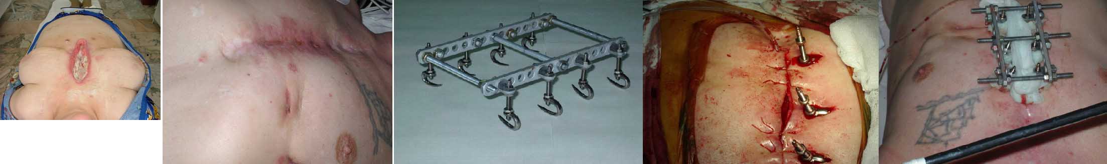 Добрый вечер, уважаемые Коллеги! Хочу поделиться опытом лечения ложных суставов грудины, осложнённых хроническим остеомиелитом. Все пациенты после аортокоронарного шунтирования. Фиксация грудины осуществлялась лавсановыми нитями. Основная проблема заключается во флотации грудины и необходимости применения аппаратов внеочаговой фиксации. Предложенный аппарат прост и состоит из комплектующих аппарата Илизарова и эндокорректора позвоночника Роднянского -Гупалова (именно крючки,которые фиксируются за дужки позвонков при сколиозе). Крючки вводятся в тело грудины посредством инструментов, которые предназначены для установки эндокорректора. Аппарат позволяет дать нужную компрессию, исключить флотацию и добиться сращения грудины. Предварительно делается полноценная санация очага остеомиелита. В одном случае производилась костная аутопластика из гребня подвздошной кости - был большой диастаз.