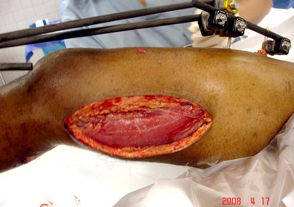 Не понятна последняя фотография : аппарат на месте и рана ушита - вы ушили рану сразу или через несколько дней, если сразу, то наверное проведенная декомпрессия сомнительна по эффекту. ( не проверяли внутрифасциальное давление после вмешательства?)