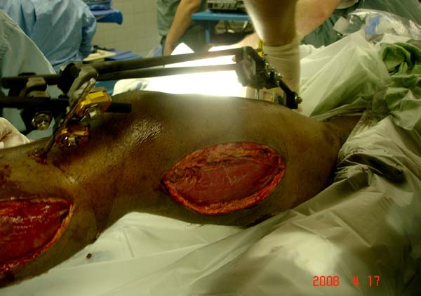 После клинического и инструментального подтверждения КС надо делать фасциотомию. На бедре имеется три: передная, латеральная и медиальная. В переднем четерехглавая мышца, вена и артерия с феморальным нервом. Доступы надо начать с латерального, и через межмышечный септум одним разрезом можно вскрыть латеральный и передние компартменты. Затем повторно надо измерить медиальный компартмент. Обычно одного доступа бывает достаточно, чтобы снять давление во всех компартаментах.