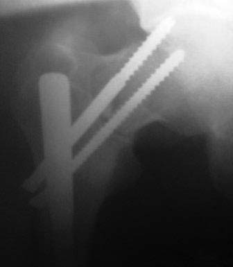 2)Для остеосинтеза шейки выбраны неадекватные винты, один из котрых полнорезьбовой,а резьба второго перекрвает зону перелома.Поэтому ни о какой компрессии в зоне перелома речи быть не может
