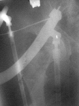 Добрый вечер уважаемые коллеги. На днях оперировал б-ного 36лет, с переломом шейки и диафиза бедра, травма высокоэнергетическая, ЭОП нет, оперируем под рентген контролем закрытым способом,т.е зона перелома не открывается, правда, получается долго. В общем в ходе операции все было хорошо и рентген контроль тоже, осталось только докрутить до конца винты, и после операции контроль.рентген ни делал, устал, и был уверен, что все нормально. На второй день у б-ного резко начали подниматься печеночные ферменты(АЛТ,АСТ)до 5-6 раз, ИФА-отр, гепатологи хотят перевести, и сделал Р-графию перед переводом. Осталcz варус, верхний винт упирается в сустав, что делать пока не знаю, может быть? винт немножко отвинтить и ждать! И тут же обратиться к Вам уважаемые коллеги! С уважением Абдурашид.