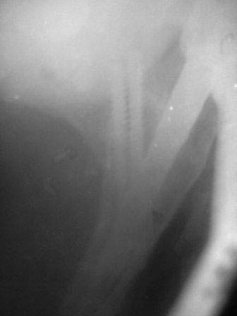 3) не исключено, что один из винтов введен мимо блокирующего отверстия, это объясняет асимметричное положение винтов в шейке, либо полнорезьбовой винт не соответствует величине отверстия гвоздя.