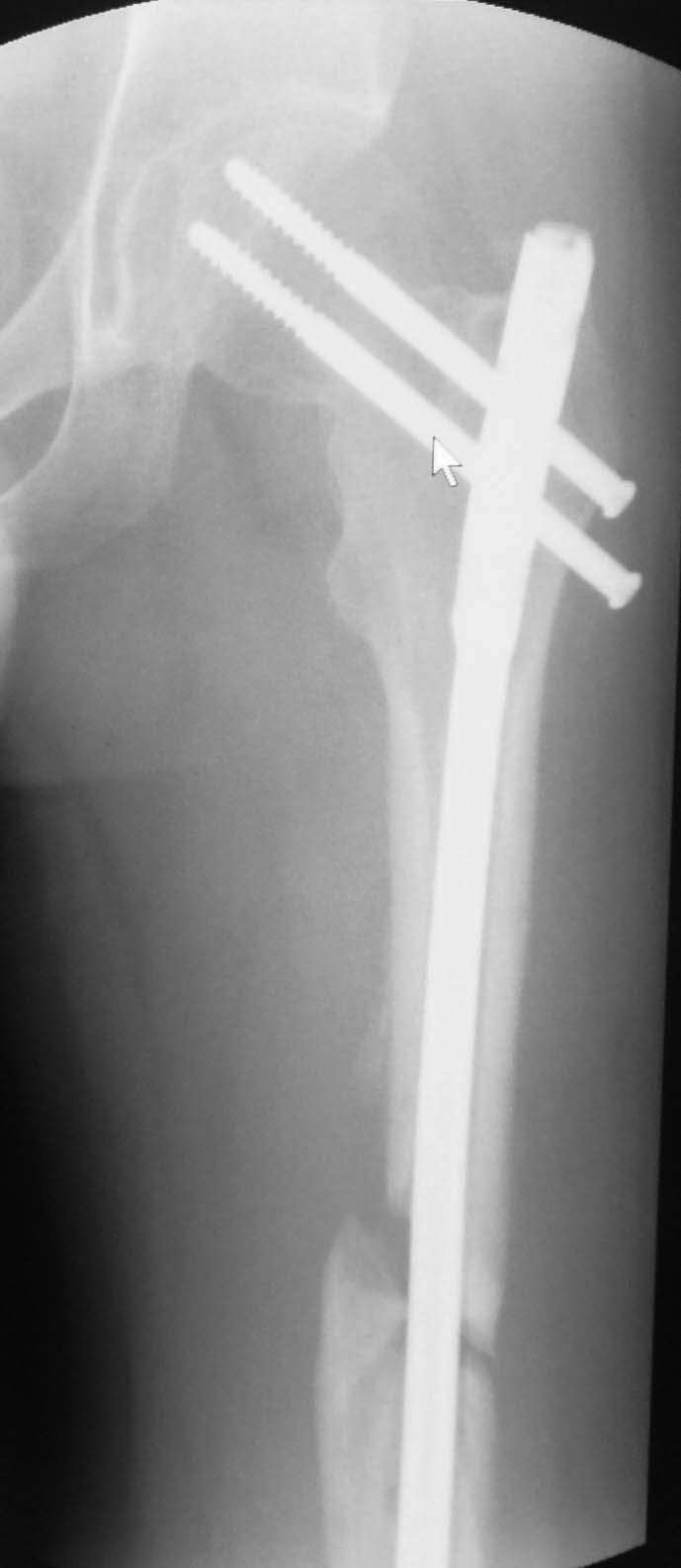 Как вариант, удалить винты из шейки, выполнить проксимальное блокирование как при переломе диафиза. Репозиция перелома шейки бедра и остеосинтез винтами мимо стержня.