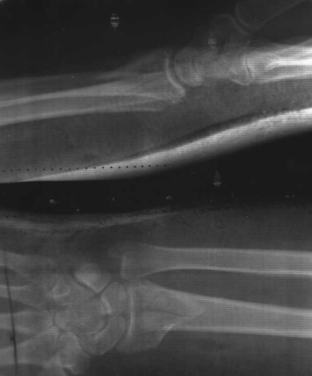 По поводу посттравматического плюс-варианта локтевой кости и спорить не надо. Думаю, что рентгенография контрлатеральной конечности это тоже подтвердит. Но вопрос стоит так: а что будет, если ничего не делать у именно такой больной? То есть просто дать срастись перелому в таком положении и заняться физиотерапией. Посмотреть. Будет клиника ульнарных болей - тогда что-то и предпринимать, например с локтевой, а не лучевой, костью. Не будет клиники - пусть живет и так. Меня, кстати, очень интересует состояние сигмовидной вырезки, которое также может иметь большое прогностическое значение при развитии атроза в дальнейшем.