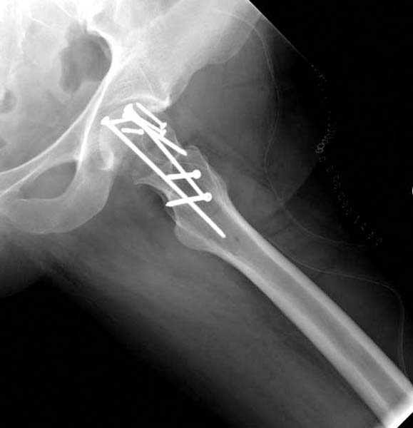 Около 11.00 вечера больная переведена в реанимацию, без сознания, но стабильная.. На третьий день провели стабилизацию перелома бедра антеградным остеосинтезом.
