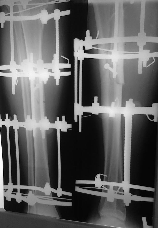 Уважаемые коллеги помогите определить с тактикой лечении. Больной И 37 лет. Закрытый крупнофрагментарный перелом верхне средний трети большеберцовой кости справа со смещением. Из анамнезе 17.05.12. травму получил в быту, спригнул с высотой 1,5 метра и падвернул правую ногу. 22.05.12. произведено ВКДО большеберцовой кости аппаратом Илизарова с фиксацией фрагмента компрессирующим винтом. 30.05.12. выписан в удов состояние на амбулаторное лечение. Через 1 мес появилась отечность, покраснение, болезненность, мутное инфицированное отделямое в проекции спица фиксирующий проксимального отломка ближе к линии излома. В амбулаторном порядке произведено перевязка, блокада с антиботиками, без особого эффекта.При осмотре костей правой голени фиксирован аппаратом илизарова, аппарат фиксирует стабильно. В области спиц, фиксирующий проксимального отломка имеется инфицированная рана около 1,5х1,5 см, перифокальное отечность, болезненность, гиперемия, из ран имеется мутное отделяемое.29.06.12. удаление фиксирующий спиц и винта и в канал установил 2 тонкие дренажные трубки для промывания ран.Получает: цефуроксим, левосин, флунол трентал, увч, для иммуностимуляции Полиоксидоний 6 мг +физ р/р 200 мл в/в.Данный момент кожа вокруг всех спиц и п/о ран гиперемирован, имеется волдырей (похоже на аллергическую). Какая тактика лучше при таких ситуациях. < | >