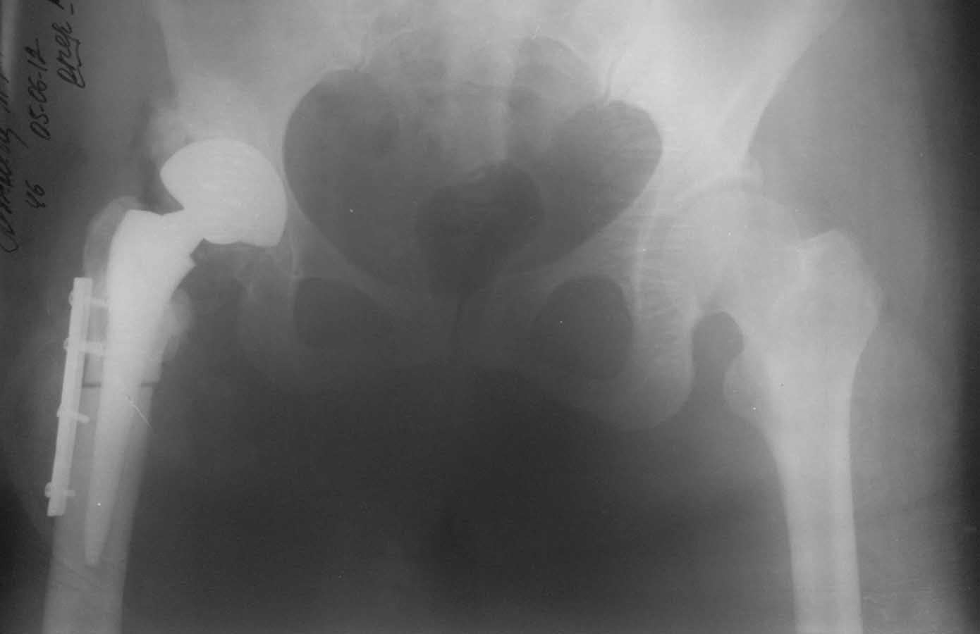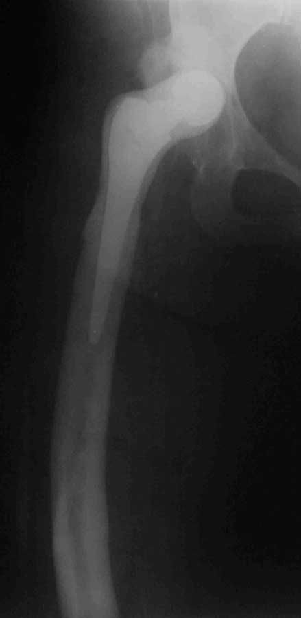 2. Бедренный компонент не выглядит стабильным, и стабильным на протезе с прокимальной фиксацией быть не может. Антиротационная пластинка слегка удерживает дистальный отломок, а плоскость остеотомии сложно назвать хорошо адаптированной. Из чего следует - бедренный компонент удалять. Вертлужный, если стабилен, можно оставить с заменой вкладыша