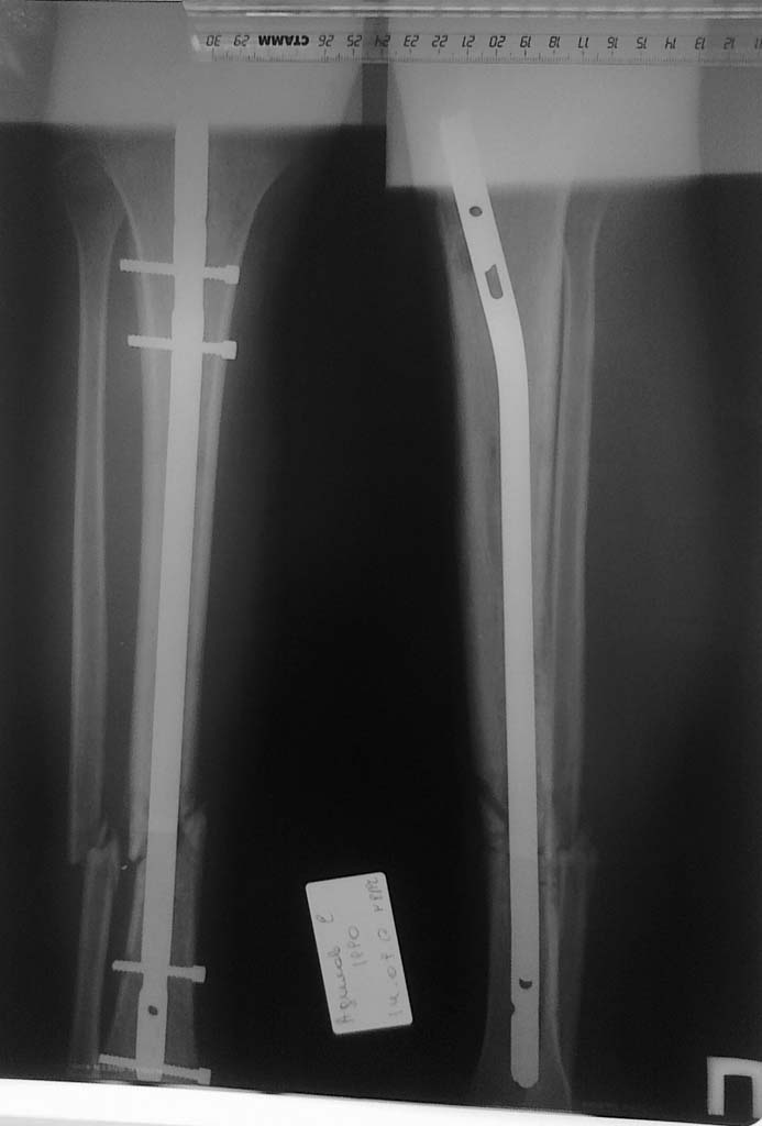 На фистулографии контраст по ходу гвоздя вверх поднялся и выходил в проекции проксимального блокирующего винта. Удалил гвоздь, хотел стабилизировать аппаратом, побоялся, потому что имеется воспалительный процесс в проекции проксимальных и дистальных блокирующих винтов, не исключается инфекционное осложнение вокруг каждый спиц. Рассверливал римером 11-12 (размер гвоздя-10) и обильно мыл канала. В зоне перелома клиническая картина ложного сустава. Установил дренажные трубки через прокс и дист отверстие для проточного промывания (дистальную др трубку соединил на ВАК) и иммобилизация гипсовой лонгетой.