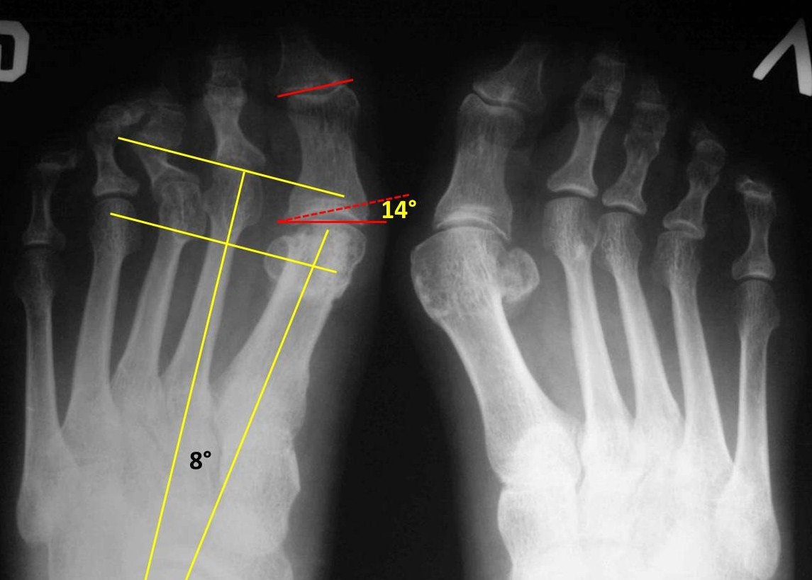 С первой плюсневой тут делать ничего не нужно, первый межплюсневый угол всего 8гр. (основные показатели отмечены схематично на рентгенограмме). Но имеется hallux valgus interphalangeus: угол между дистальной и проксимальной суставными площадками основной фаланги 14гр. Его лучше устранить с помощью остеотомии Akin, чтобы первый палец не мешал стать на место второму. Преобладание длин 2 и 3 плюсневых объясняет перегрузку их головок. 4-я плюсневая даже короче, чем могла бы быть относительно первой (перпендикуляр к оси 2 плюсневой, проведенный через середину латеральной сесамовидной кости, в норме должен пройти через середину головки 4 плюсневой. А он проходит выше). Получается, что вмешиваться нужно на 1 луче (дистальный Akin) и на втором с третьим. Задачи, которые тут нужно решить: укорочение 2 и 3 плюсневых (Weil, фиксированный или нет - на Ваш вкус) и устранение молоткообразной деформации 2-3 пальцев. Если она нефиксированная, то достаточным может оказаться подкожной тенотомии разгибателей на уровне плюснефаланговых суставов. Без всякой Z-пластики. А если деформация фиксированная или полуригидная, тогда на Ваш выбор: остеотомия основных фаланг или (хуже) резекция их оснований. Или еще что-нибудь.