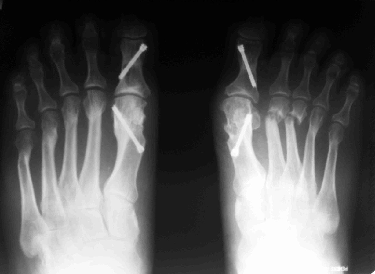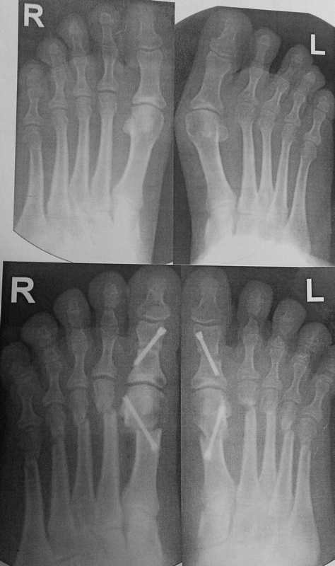 Уважаемые коллеги, я понимаю, что уже утомил вас оперированными стопами, но помогите еще с одним случаем Женщина около 50, активная, оперирована 1 год назад. Тип остеотомии в выписке не указан (похоже с 1-го по 5-ую + фаланги). Сожалею. что фото стопы не удалось выложить, клинически - выраженная девиация всех пальцев стопы слева. Что предпринять? Латеральный релиз, утягивание (лучшего синонима не нашел) медиальной капсулы+остеотомии 4-5 с нормальной повязкой? 1-ый луч - SERI (для жесткости остальных- к нему притянуть), но, головка и так скомпроментирована (или это не брать в расчет?)+ освежение ложняков+ коррегирующая остеотомия 4-5 Weil с фиксацией винтом (или без фиксации?). С фалангами что делать? Кажется, что ничего?