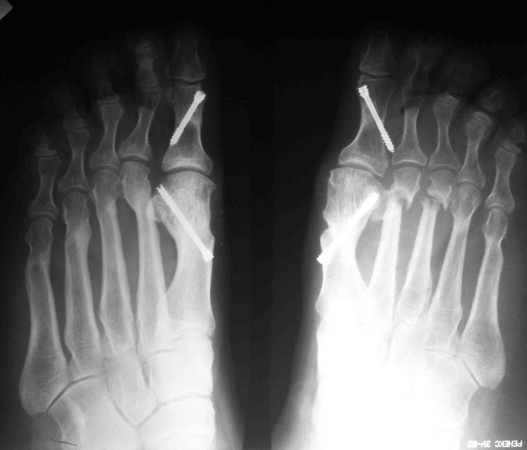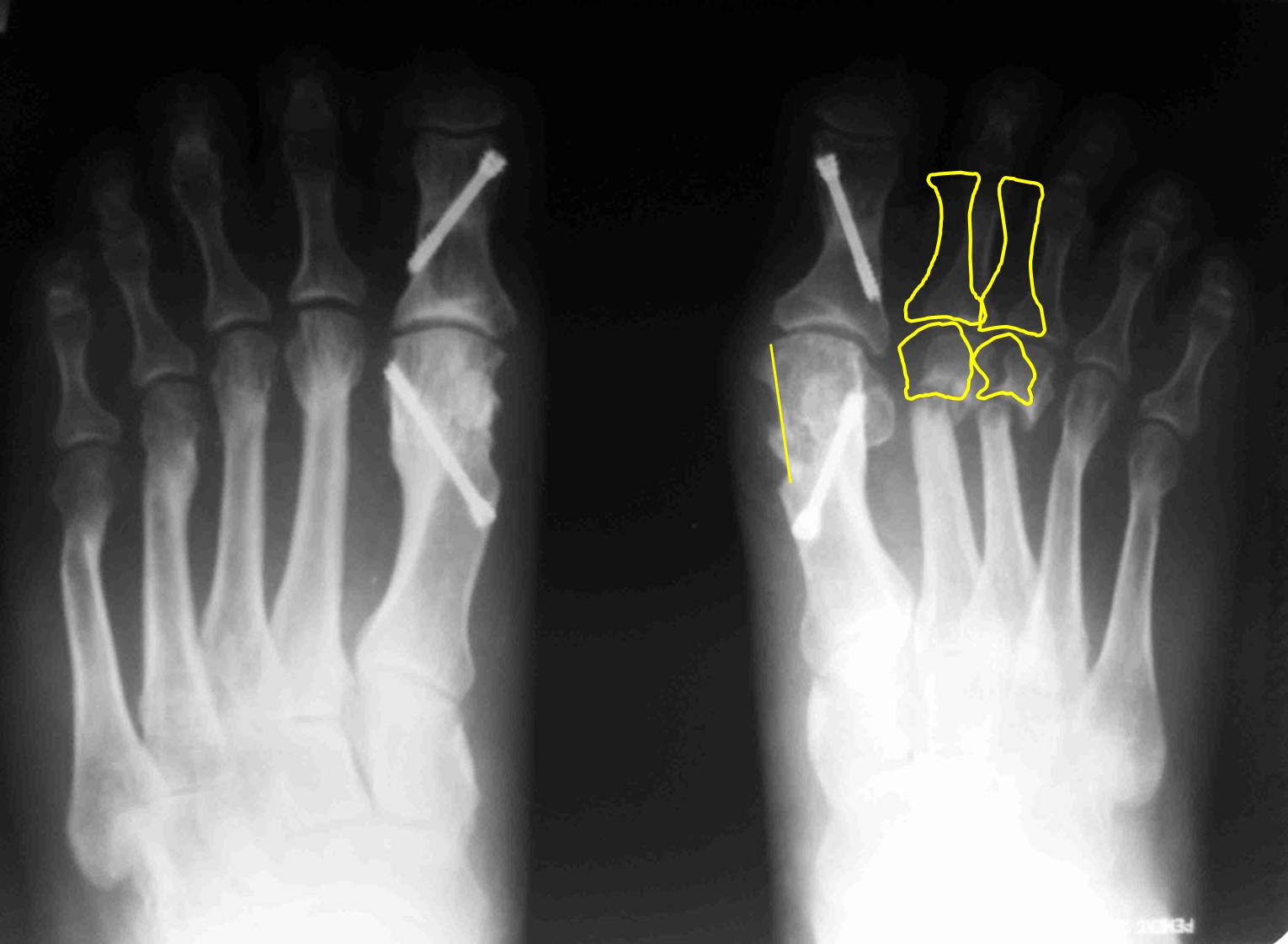 А чего Вы притесняетесь? Насчет "утомил вас оперированными стопами". Такая же ортопедия, как и вся остальная, обсуждаемая на форуме. Да еще сложный ревизионный случай. Изначально то все здорово было. Так бывает, к сожалению, когда все вроде правильно сделано, а в результате не складывается. Почему-то 2 из 10 плюсневых не срослись. На прошлогодней конференции AOFAS был доклад о неудачах после операций на стопе, в котором авторы выделили группу «нестрастальщиков»: пациентов, которые не срастаются без очевидных причин для этого. Может и здесь подобный случай. Из предложенного Вами плана не ясно, зачем делать SERI? Ее ведь сделали год назад. Только не стандартный вариант с фиксацией спицей, а более сложный, с внутренней фиксацией. Возможно, в этом была причина избыточной латерализации головок: подошвенные пластинки 1 и 2 плюснефаланговых суставов тесно связаны. Слишком радикальное уменьшение первого межплюсневого угла за счет латерального смещения головки первой плюсневой привело к дестабилизации нефиксированных остеотомий 2 и 3 плюсневых. И если сейчас еще больше переместить головку первой плюсневой кнаружи, это только усугубит ситуацию. На схеме я показал, в каком положении окажутся 2 и 3 пальцы в случае репозиции головок их плюсневых: расстояния между 1 и 2 лучами итак практически не остается. Я бы в данном случае подровнял внутренний контур головки 1 плюсневой, удалил винт из основной фаланги, выполнил латеральный релиз 1 плюснефалангового, эйкиноподобную остеотомию основной фаланги 1 пальца; репозицию головок 2-3 плюсневых с фиксацией их головок спицами на 4-6 недель и положив в область ложных суставов костную аутостружку или какой-нибудь искусственный заменитель кости. Если при этом пальцы не станут ровнее – выполнил бы остеотомии основных фаланг соответствующих пальцев. Без вмешательства на 4-5 плюсневых.