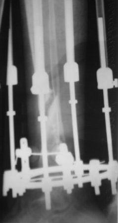 Контрольная Р-грамма на аппарате Илизарова после дистракции, теперь видимо придется стабилизировать аппарат после устранения остаточных деформаций.