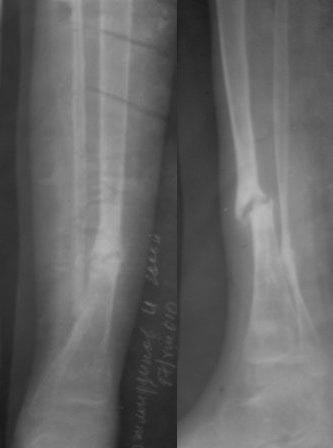 Речь без сомнения идет о врожденном ложном суставе, что видно на рентгенографии и клинически. Данные переломы и деформации будут беспокить мальчика пока не завершится рост костей, оперируя либо с поммощью апп. Илизарова или интрамедулярным остеосинтезом, больший опыт накоплен сотрудниками РНЦ ВТО им. акад. Илизарова, где сам Илизаров начинал эту тему. Стоит сказать лишь одно, при врожденном ложном суставе происходить некие изменения с a.Nutricia, что мы видели на МРТ и КТ и её полное отсутсвие в н/3, и фиброзное перерождение концов отломков и большое рубцеобразование вокруг ложняка. В данном случае не стоит рассверливать и имплантировань в костномозговой канал металлические стержни для фиксации. Лучше выбрать ЧКО, литература в библиотеках. Удачи.
