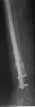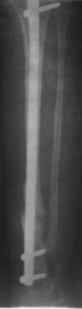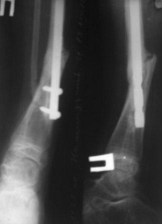 Уважаемые коллеги! помогите советом! Мальчик 2000 г.р. В 2007г получил перелом н/з костей правой голени, в районе лечили гипсом 6 месяцев, сращения нет, в обл.центре КДО аппаратом Илизарова - 3 месяца, после повторная деформация, в НИИТО КДО аппаратом Илизарова -7 месяцев, перелом якобы сросся, но после снятия аппарата через 2 недели после незначительной травмы повторный перелом. И родители начали лечиться у различных табибов и знахарей, мальчик не наступал, ходил с двумя костылями, одели различные ортезы и повязки, и нога сильно атрофировалась.(Мне кажется у ребенка был врожд. ложный сустав, латентная форма) , и в 2011 г, в октябре обратились к нам. , было произведена после рассверливания канала БИОС плечевым стержнем,но стержень пошел по мед.стенке дистального отломка поэтому остался некоторый вальгус(операция без ЭОП) ребенок через неделю начал самостоятельно ходить, клинически деформации нет, все обрадовались, выписали, повторно приехали только ч-з 1,5 года вот с такой деформацией, но ребенок ходит в школу, бегает, незначительно хромает, родители требуют исправить деформацию. Пока в голове один план: удалить стержень, закрытая остеоклазия, аппарат Илизарова из двух колец постепенная коррекция деформации, рассверливание к/м канала, БИОС плечевым стержнем (чуть длиннее), дистально по латеральному кортексу с использованием поллерных винтов и спиц. С уважением Абдурашид.