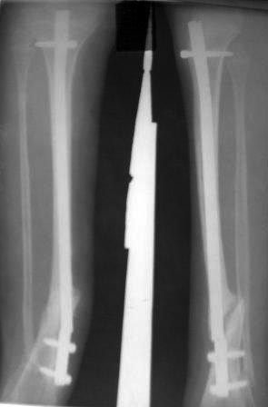 Сегодня сделал рентген, гвоздь сломался, видимо, усталостный перелом. Гвоздь и сломанная часть легко удалены, пока дистракционный остеосинтез аппаратом Илизарова, и будем постепенно исправлять деформацию. микрохирургия не доступна, оказалось, родители и повторный БИОС не могут из-за финансов,у читывая что ложный сустав не атрофичный и даже несколько гипертрофичный может продолжать аппаратное лечение? Или еще какие варианты? ,будем думать.