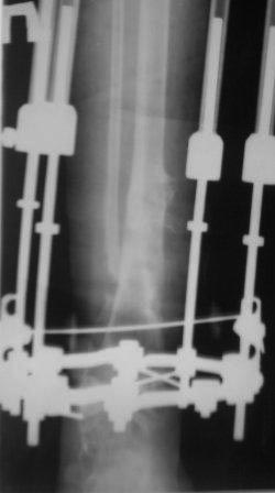 Контрольная Р-грамма на аппарате Илизарова после дистракции, теперь видимо придется стабилизировать аппарат после устранения остаточных деформаций.