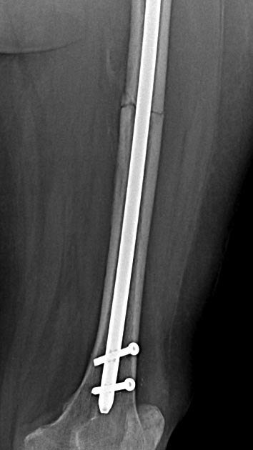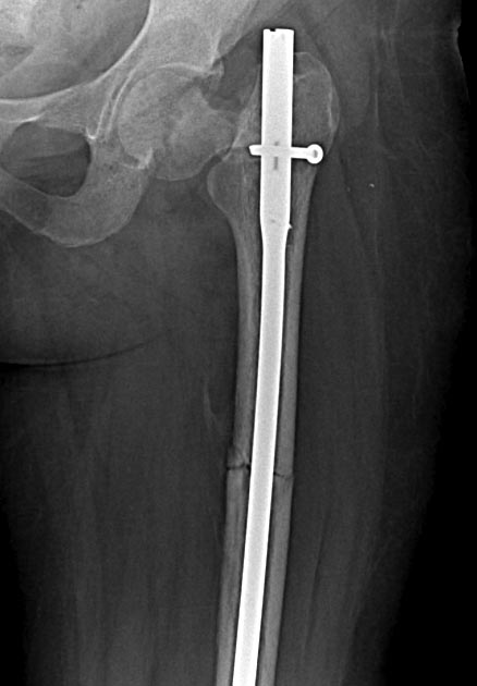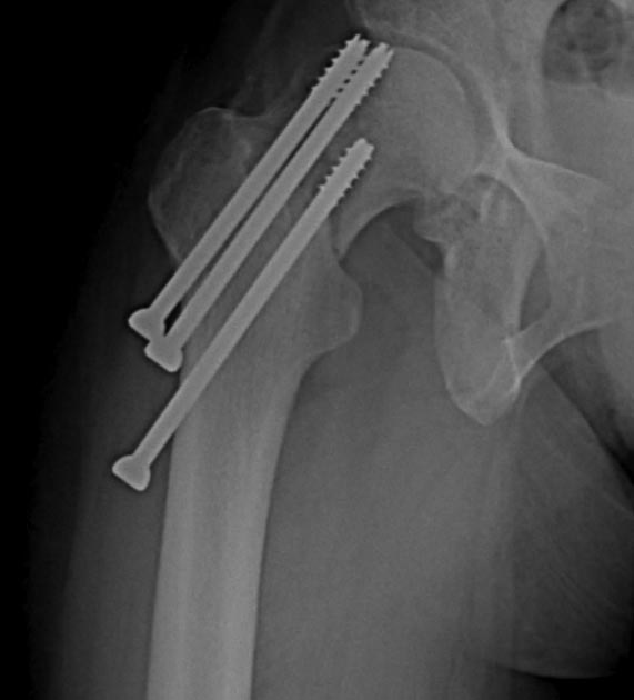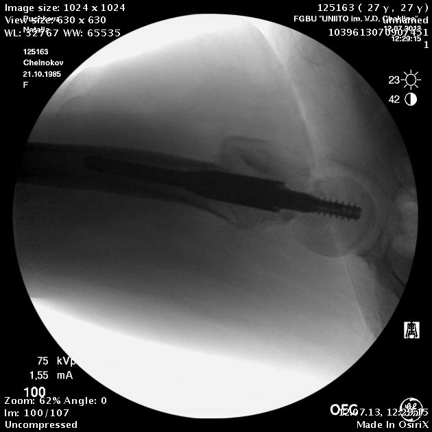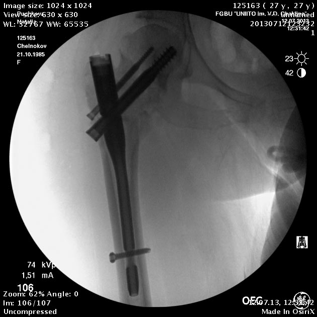 Добрый день! Коллеги! Складывается впечатление, что вальгизация выполнена на уровне перелома шейки бедренной кости, а не в межвертельной зоне, непонятна возможность компресси в зоне перелома (винты позиционированы резьбовой частью в зоне перелома). и уж совсем не понятно статическое блокирование дистальной части штифта. С уважением Ушаков С.