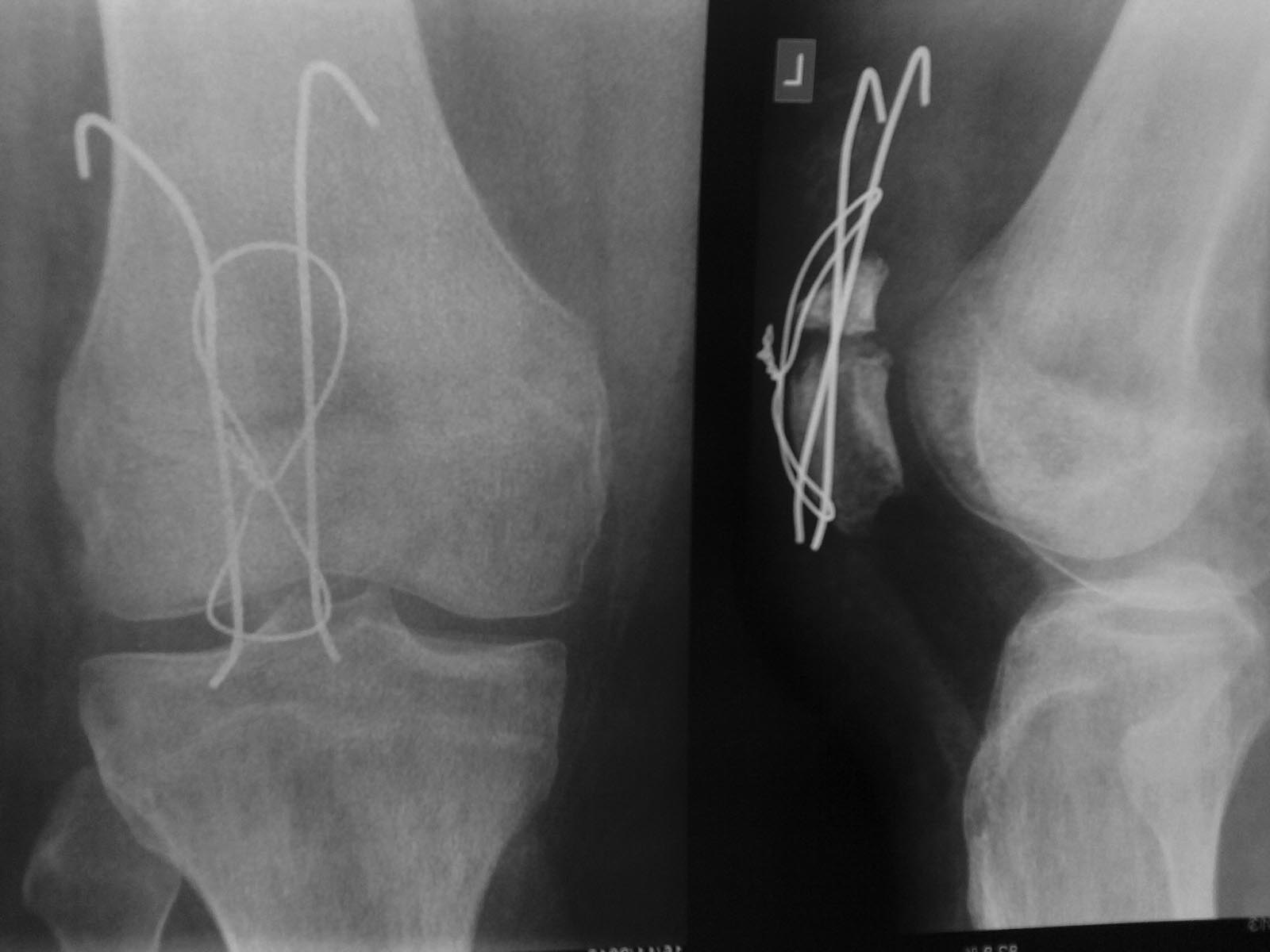 Здравствуйте! Мало информации, непонятно даже когда была последняя операция, это раз. Затем непонятно почему такие длинные концы спиц оставлены - будут мешать разработке. Если не ошибаюсь когда-то Джолдас выкладывал как они лечат в Сент-Луисе. Вместо проволоки и спиц через 4 туннеля проводят Этибонд №4 или №5 и стягивают. Реабилитация почти сразу. Я так понимаю, что на сегодня контрактура уже есть, поэтому надо разрабатывать. Смысл операции в стабильном остеосинтезе и ранней реабилитации. А получить сращение и тугоподвижный сустав это не есть хороший результат.