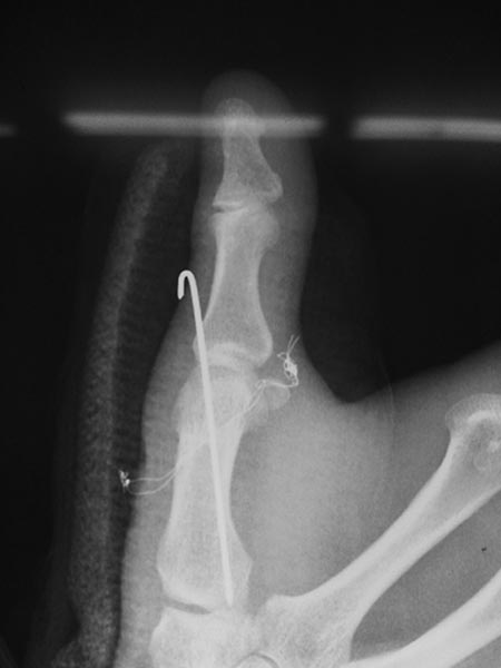 Со слов пациента оперирован по поводу вывиха в пястно-фалангового сустава, вывих закрытый, без повреждения сухожилий (первичных снимков нет). Сделали вот такой остеосинтез (см. фото). Не можем понять для чего проволока??? Пациенту рекомендовали тайландскиие врачи удалить проволоку через 2 месяца со дня операции, проволока выведена на кожу с 2-х сторон.