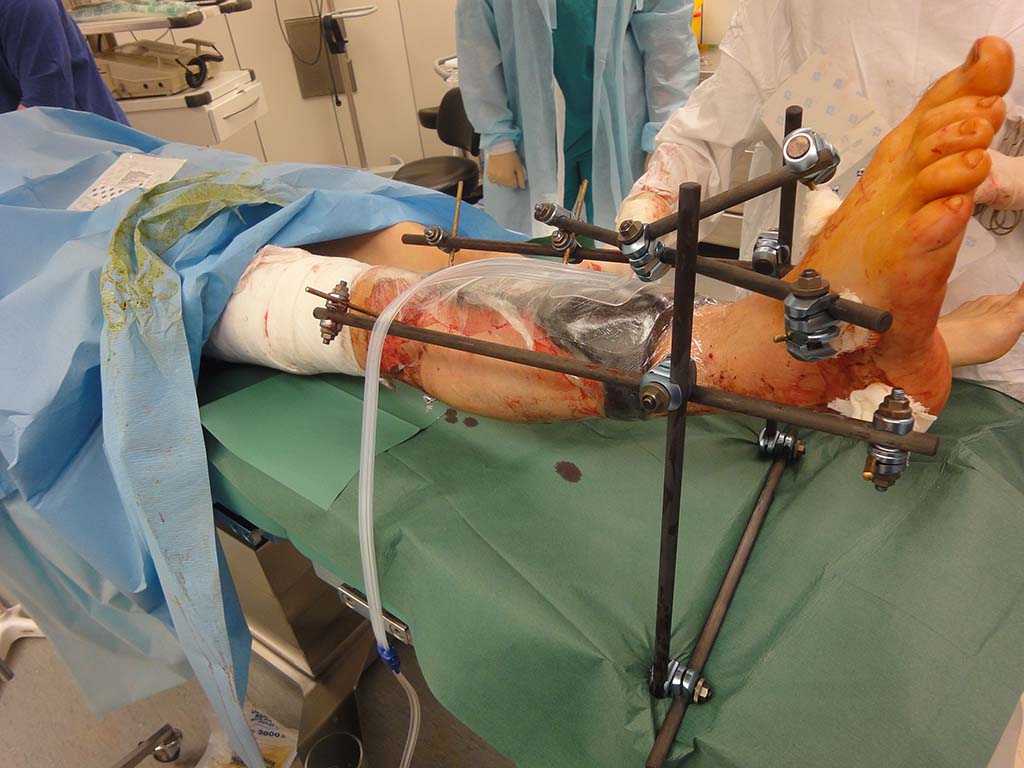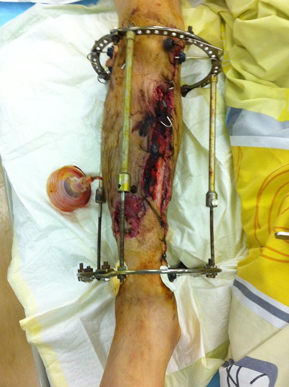Cделали так: развернули медиальное брюшко m.gastrocnemius и пришлось взять m.ext.dig.longus,т.к слишком большой дефект. Перемонтаж аппарата на ExFix. Кожный лоскут с бедра и вак-дренаж. Посмотрим, что из этого получится