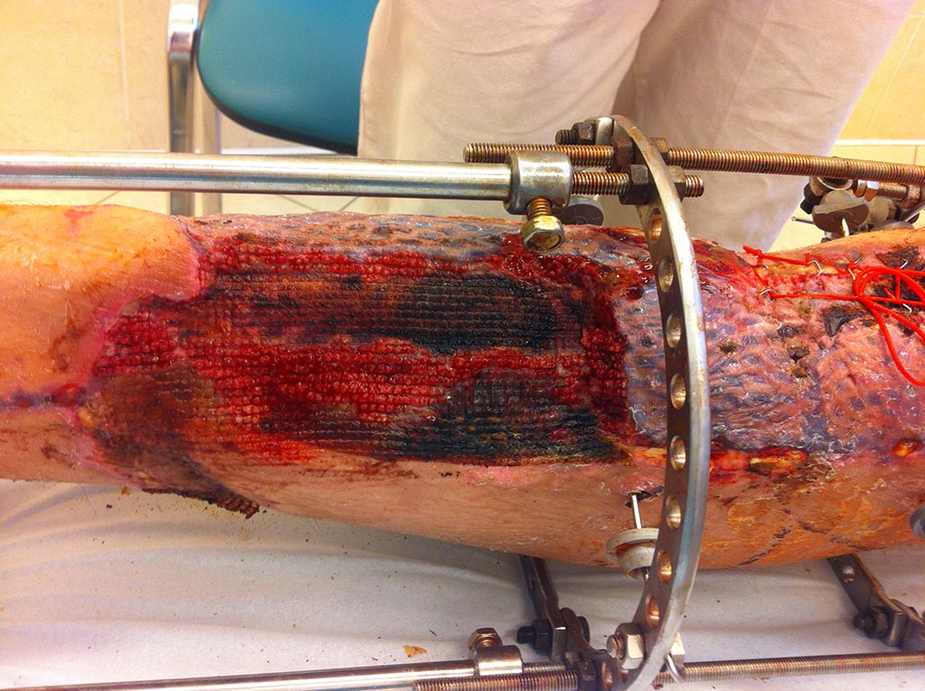 Спасибо за вопрос! Фотки выложу, они на работе в компе. Прижилось место пересадки брюшка m.gastrocnemius, умерло место пересадки разгибателя, поставили аппарат Илизарова, на аппарате выполнили репозицию отломков. Выждали полное формирование некроза, его иссекли, полечили консервативно, готовим место для торакодорзального лоскута. Как то так! Долго и муторно, но надо добить