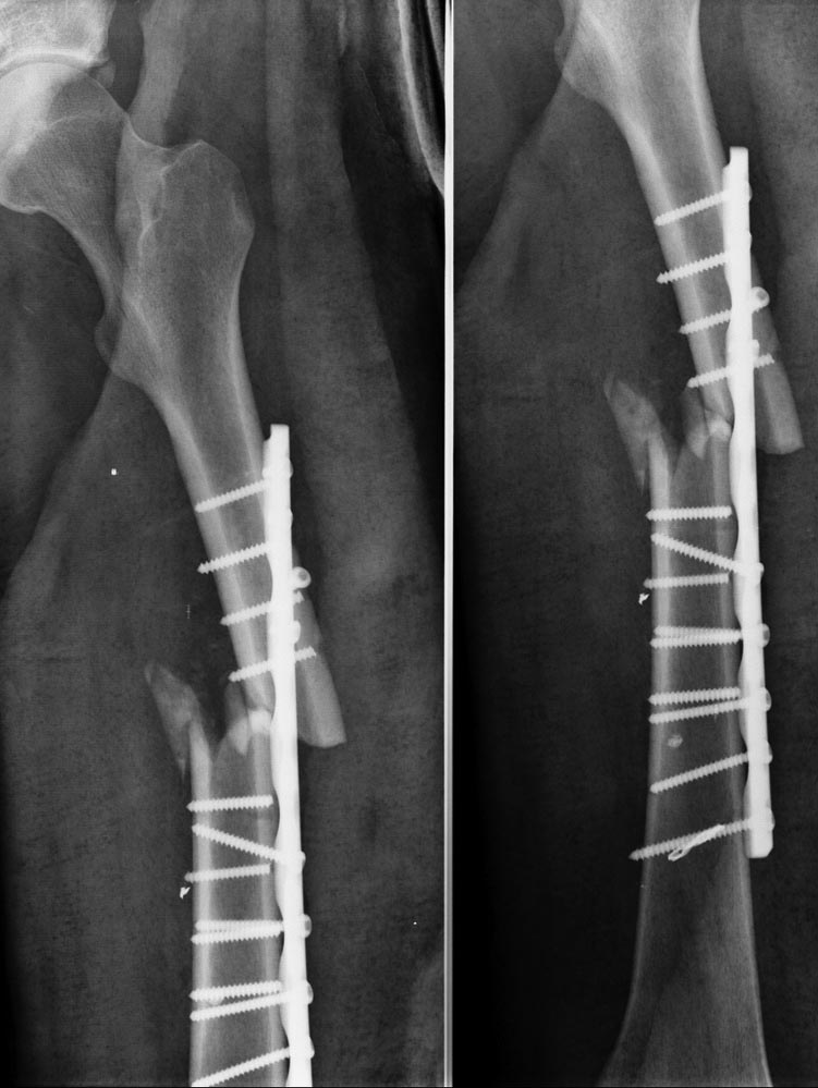 2. Почему выбрали именно такое сочетание остеосинтеза бедра и голени (пластина на бедро и АВФ на голень)? Получается, что вся масса н/конечности ниже перелома бедра держится на пластине с винтами...