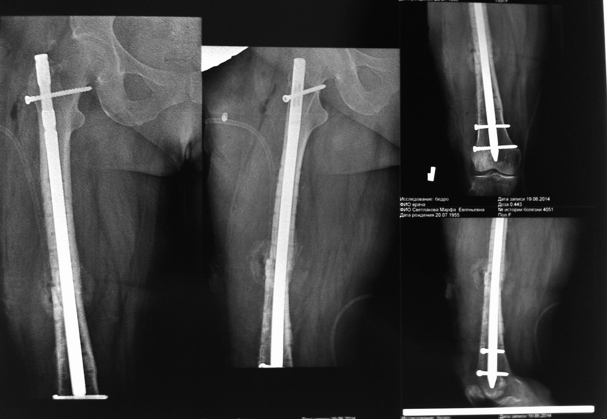 Удалили пластину, рассверлили канал, компрессия и заблокировали сразу в динамику. На 3 сутки ходьба с костылями с 50% опорой на ногу, ЛФК. Пациентка результатом довольна.