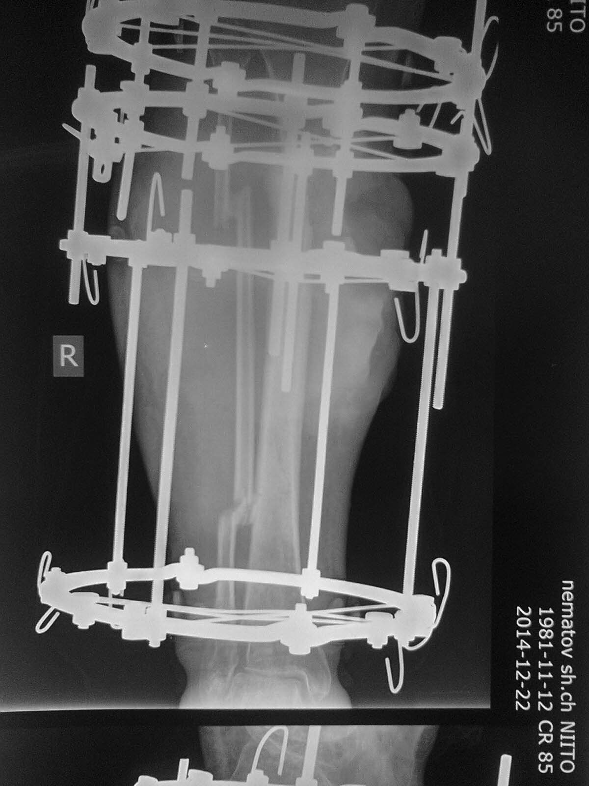 Доброго времени суток, уважаемые коллеги!Прошу Вашей помощи в лечении пациента Н. Пациент, 33 г. Травма в мае 2014 года в результате ДТП (сбит машиной). Оперирован в институте (или центре) травматологии и ортопедии одной из среднеазиатских республик (уроженец этой республики). Обратился к нам в августе, по поводу наличия гнойной раны внутренней поверхности голени с обильным отделяемым. (Рентгенограммы- фото 1). Выполнено: остенекрсеквестрэктомия, резекция концов отломков, перемонтаж аппарата (фото 2). Рана успешно зажила, пациент исчез из вида. Неделю назад пришел снимать аппарат с рентгенограммами (фото 3,4). Ходит с полной безболезненной нагрузкой на конечность, АВФ стабилен, раны от опорных элементов спокойны, отек конечности умеренный, в проекции бывшей гнойной раны- втянутый рубец (если необходим внешний вид конечности, то смогу выложить на следующей неделе,наверное). Учитывая большой дефект кости по задней поверхности кости, боимся, что при нагрузке без аппарата произойдет перелом. Вопрос: что делать? Наши варианты: 1.снять АВФ, рассверлить канал, установить штифт с антибактериальной мантией в виде "протеза" кости; 2.Резекция дефектного участка, остеотомия в н/3, перемонтаж АВФ и билокальное замещение дефекта. Что Вы посоветуете? Спасибо всем откликнувшимся.