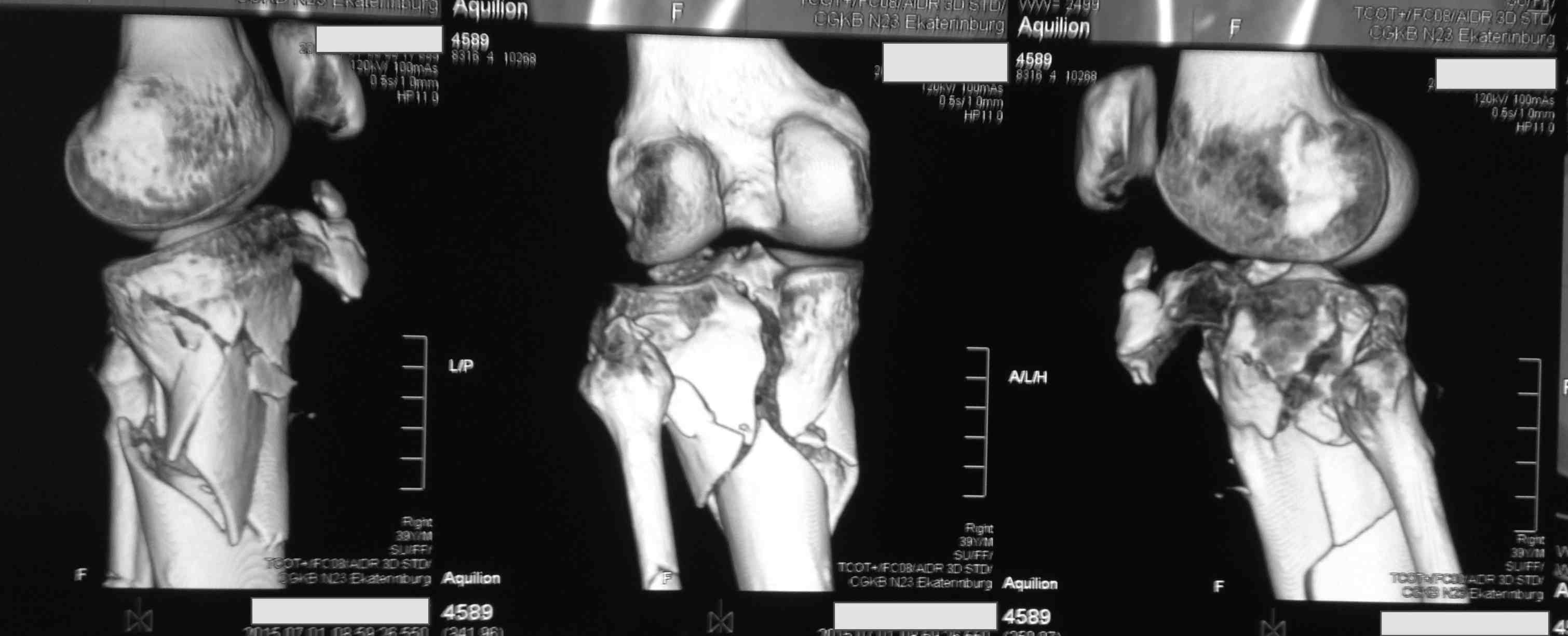 На голени приемлемую репозицию можно сделать закрыто. Фиксация может быть спицами и аппратом или винтами и аппаратом (разгрузка сустава). На бедре для полноценного восстановления функции необходима артротомия и остеосинтез (доступ Кохера, похоже фрагмент заднего края вертлужной впадины).