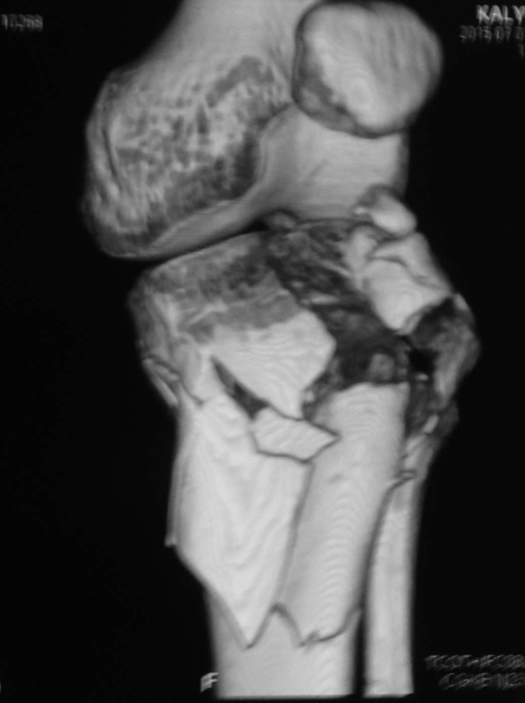 Голень-41-С3.1 - полный внутрисуставной и метафизарный оскольчатый перелом с доминантным повреждением наружного мыщелка, с импрессией центральной части плато. Первичная тактика полный респект по АО и ОТА. на фоне лигаметотаксиса выполнено КТ, которое четко детализирует повреждение и определяет дальнейшую тактику.