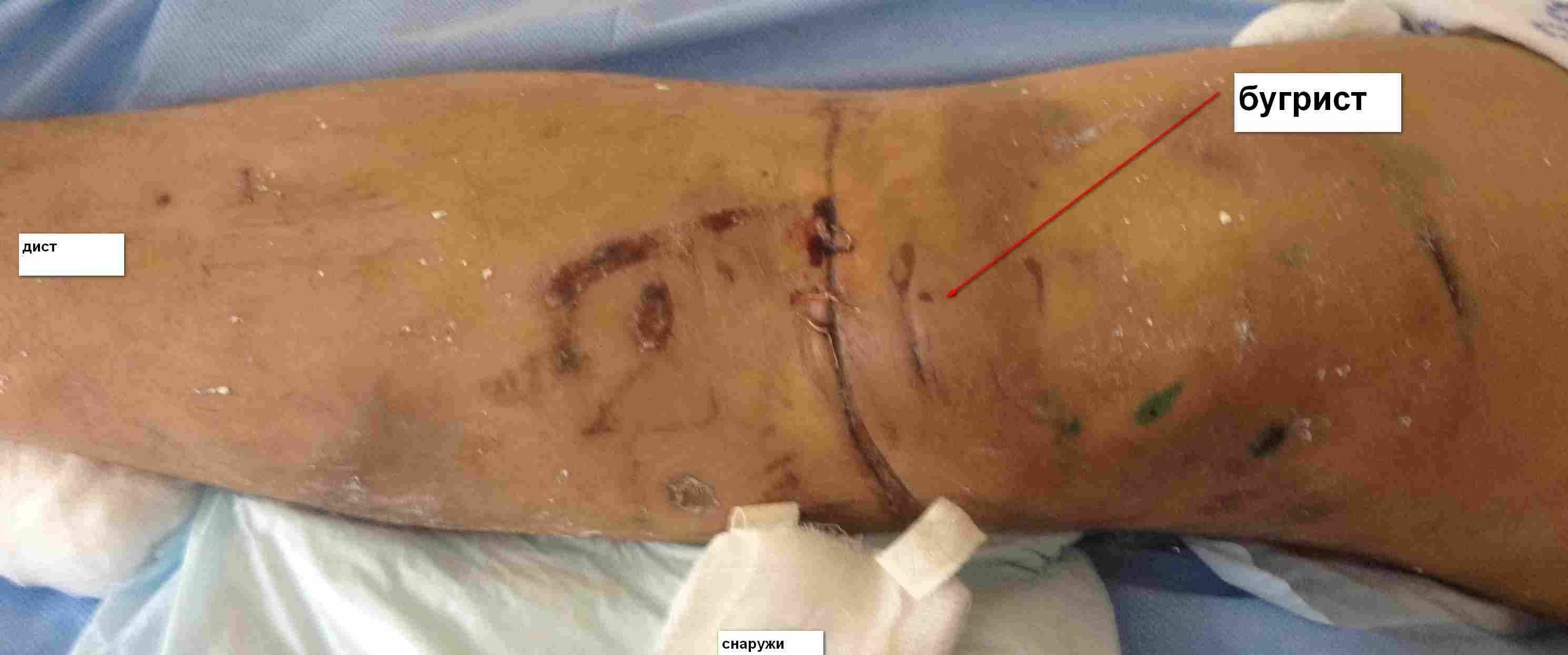 на самом деле небольшая рана спереди под швами, а по краямосаднение