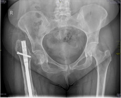 18.03.2015 Выполнен реостеосинтез правого бедра интрамедуллярным стержнем с антибактериальным покрытием со статическим блокированием. На 3-и сутки после операции пациентка была активизирована: начала ходить с помощью костылей с частичной нагрузкой на правую ногу. На повторном приеме через 3,5 месяца после операции установлен диагноз: сросшийся перелом правой бедренной кости после остеосинтеза интрамедуллярным стержнем, псевдоартроз шейки правой бедренной кости.