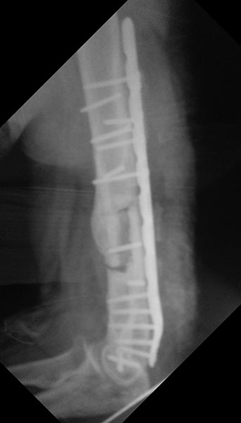 Далее уже только на операции можно решить вопрос фиксации. Если краситель по свищу к перелому/пластине не идет - можно рискнуть и при уверенности в полноценной хирургической обработке поставить новую пластину.