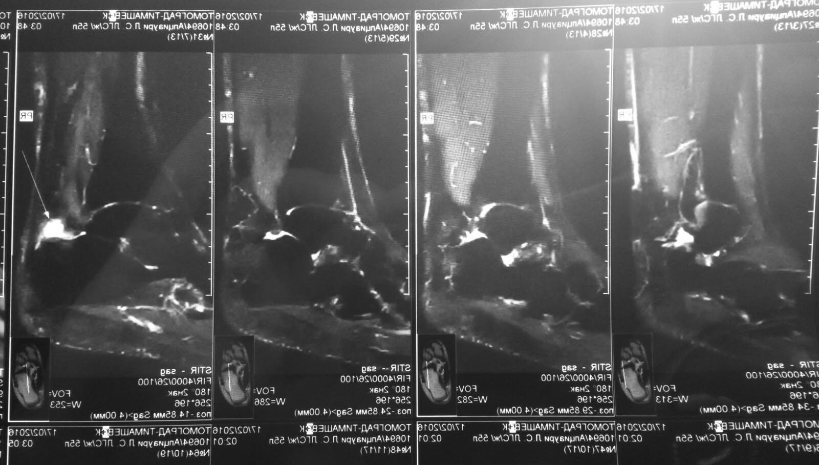 Коллеги, прошу помощи в тактике лечения.Пациентке прибилизительно 55-60 лет, носит каблук, повышенного питания. В течение года беспокоят боли в зоне пяточного бугра. Инъекций в ту зону не получала. Попала к нам в клинику около недели назад на консультацию, заподозрили стресс перелом пятки, назначили МРТ На МРТ такая вот картина! Думаем что делать. Как вариант может ахиллотомию закрыто, потому как ей легче ходить на каблуках, соответственно при статической перегрузке без каблука боли усиливаются