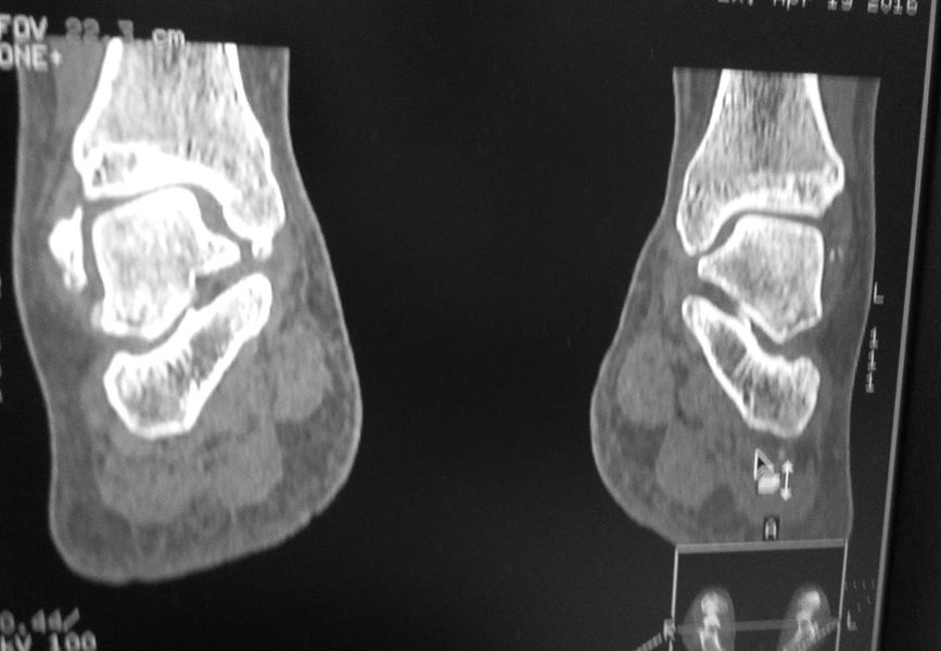 Травма три года назад. Упала с высоты своего роста, подвернула ногу, лечилась амбулаторно с Ds : растяжение связок голеностопного сустава. Rg не делали. После травмы боль осталась, в динамике интенсивность боли прогрессировала. Ухудшение в течении последних 6 мес. Местно : движения в голеностопном суставе в полном обьеме, отек незначительный. Пальпация безболезненна.Rg, Кт прилагается.