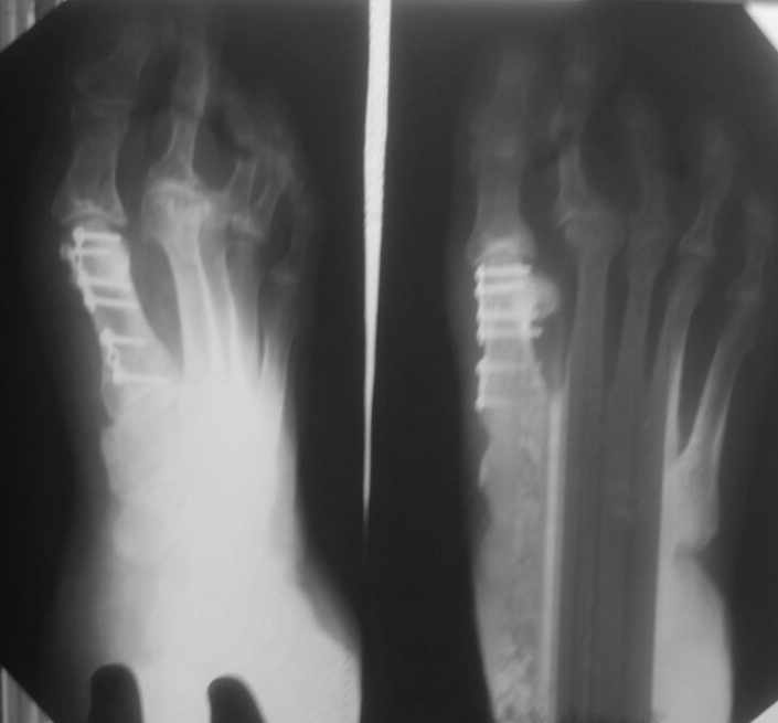 Неутолимое желание поставить больше железок. 6 или 7 винтов и 2 пластины на одну плюсневую. Первичных снимков нет, но можно предположить, что 2 остеотомии привели к значительному укорочению М1. В результате - переходная метатарзалгия. Была или нет до операции деформация центральных пальцев тоже не знаем. Сейчас видны молоткообразная деформация второго пальца с преобладанием его длины над первым, перекрест второго и третьего пальцев. Если выпрямить второй - станет еще длиннее. А выпрямить может помешать отклоненный кнутри третий палец - второму некуда улечься. Поэтому нужно думать об остеотомии 2-4 плюсневых для устранения метатарзалгии (фиксированный или нефиксированный Вейль, DMMO - чем владеете), коррекции молоткообразной деформации второго (с его укорочением) и варусной деформации третьего пальца (возможно и четвертого, если будет мешать выпрямить третий). На болезнь Фрайберга не очень похоже. Скорее это подвывих пальца на некачественных снимках имитирует. В любом случае - моделирующая резекция - калечащая сустав операция. Декомпрессии за счет укорочения будет достаточно. Если есть возможность оперировать чрескожно - самый простой и беспроигрышный вариант.