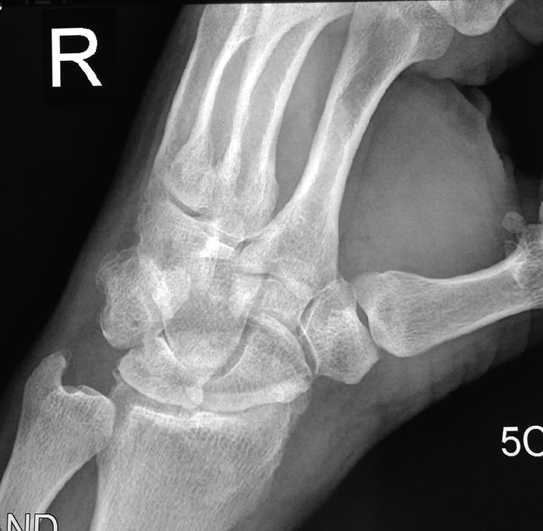 Для начала нужно говорить о тактике обследования. Если не КТ, то хотя бы косую проекцию для вывода ладьевидной кости. И боковую, конечно. Подобные долгоиграющие травмы чаще всего бывают при ложных суставах ладьевидной кости. А здесь уже есть артроз между лучевой и ладьевидной костями. Расширено расстояние между ладьей и полулунной. Скорее всего замешана ладьевидная кость.