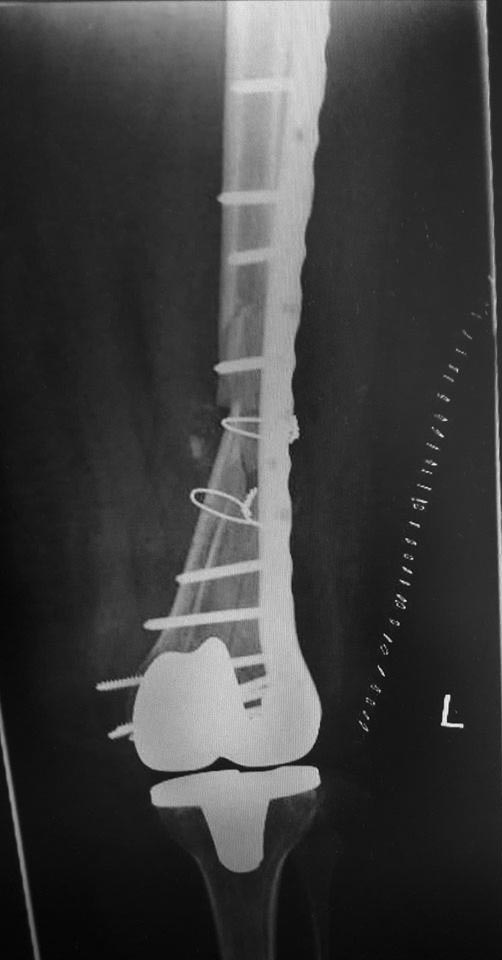 Учитывая, что протез без стабилизатора, межмыщелковое пространство абсолютно свободно и оптимальным вариантом в данном случае мог стать ретроградный интрамедуллярный остеосинтез с блокированием как самый малоинвазивный и сохраняющий и без того того повреждённое кровоснабжение через надкостницу. Выполненный накостный остеосинтез нельзя отнести к стабильному, к тому же по представленным рентгенограммам складывается впечатление, что винты проведённые через мыщелки обычные кортикальные, не фиксированы в пластине, серкляжные швы не придают стабильности. Потребуется длительная контролируемая реабилитация. Не исключается по результатам рентгенконтроля повторное оперативное вмешательство (костная пластика или всё-таки переход на интрамедулляный остеосинтез)