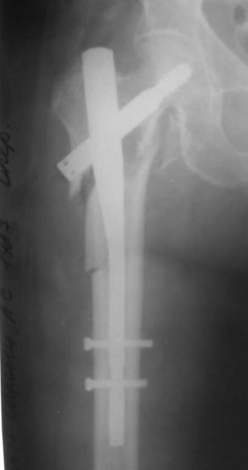 заднего захода тут точно нет,а чуть кпереди - здесь бы ничего не решило (делали и так). Это уже не первый раз такое с этими гвоздями. Просто уже накипело. Чуть поуже или покривее бедро - упираются в передний кортекс. У многих что-то вроде tip pain. Было 2 периимплантных перелома, на мой взгляд связанных именно с этим. Сломался по дырке, мне кажется и в тисках не получится, сплав какой-то непластичный совсем.
